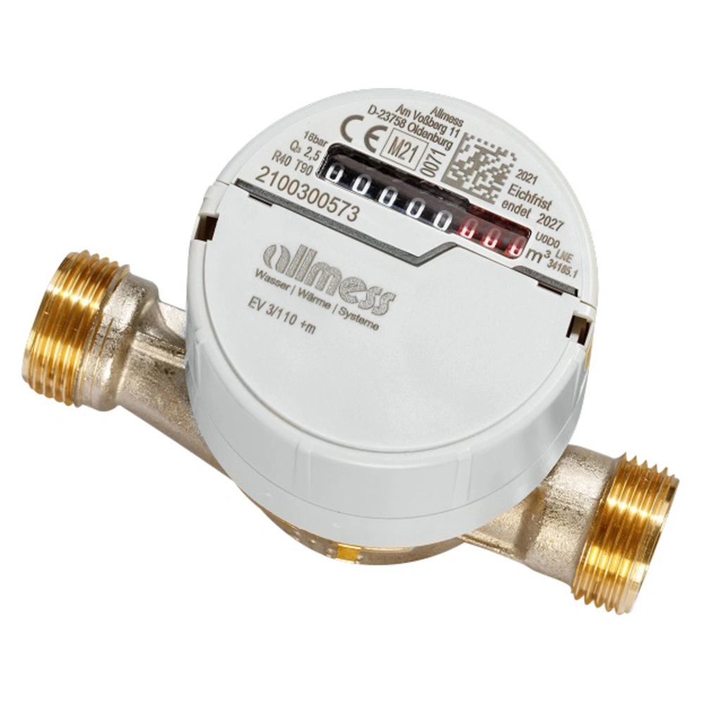 Universele schroefwatermeter voor horizontale of verticale opbouwmontage. De volledig drooglopende meter is uitgerust met een magnetische koppeling en een rolteller die 360° kan worden gedraaid. Hij is draadloos geschikt en voorbereid voor een communicatiemodule.