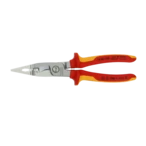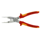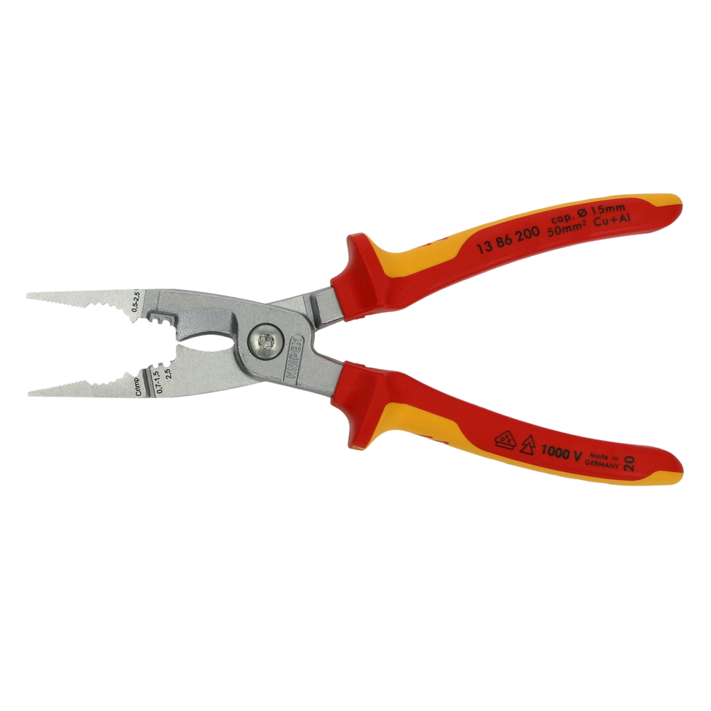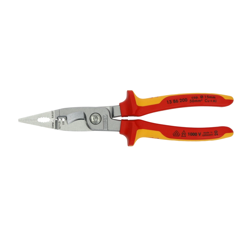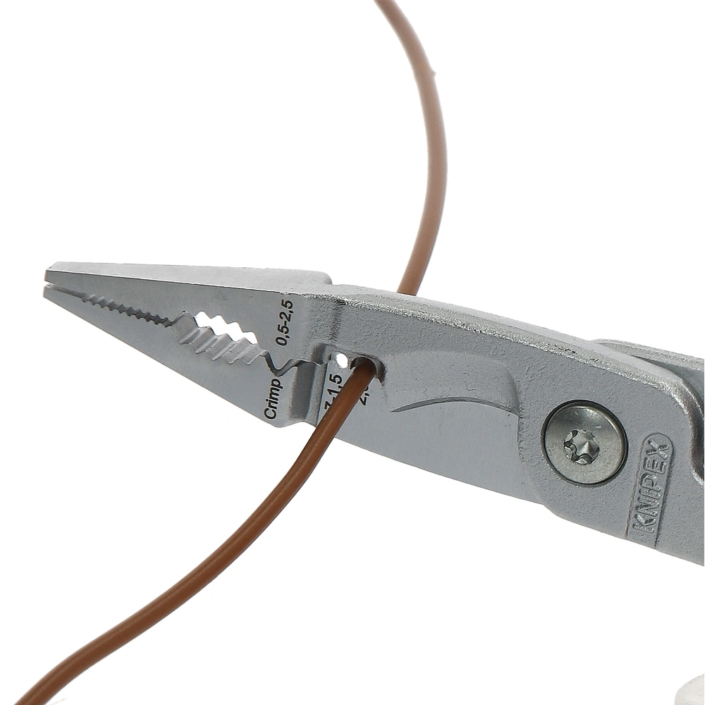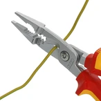 Universele tang voor het knippen, strippen, buigen, krimpen en grijpen van kabels. Ook bij uitstek geschikt voor het ontbramen van aansluitdozen. Met het slanke gereedschap kunt u alle gangbare werkstappen in de elektrische installatie uitvoeren. Dit voorkomt constante gereedschapswisselingen en bespaart tijd, ruimte en gewicht. De tang heeft afstripgaten voor aders van 0,75 / 1,5 en 2,5 mm², een krimpnest voor adereindhulzen van 0,5 tot 2,5 mm² en knipt als kabelschaar alle kabels tot 5 x 2,5 mm² en met geharde precisie-snijkanten Ø 15 mm. De multitool is goedgekeurd voor het werken aan spanningvoerende componenten tot 1000 volt.