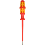 VDE-geïsoleerde, individueel geteste platte schroevendraaier voor veilig werken tot 1000 V volgens IEC 60900. De ergonomische Kraftform-handgreep heeft harde zones voor hoge werksnelheden en zachte zones voor een optimale koppeloverdracht...