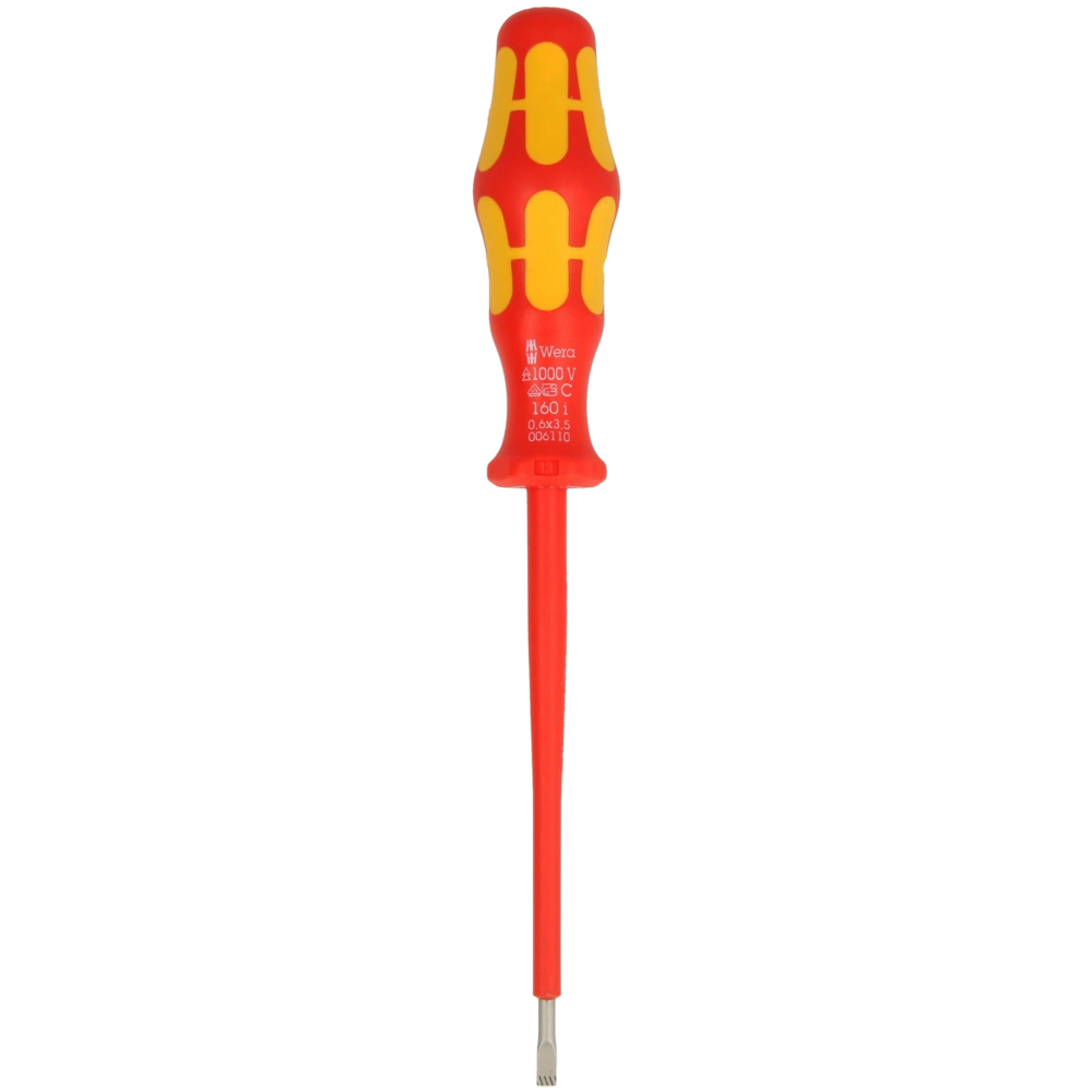 VDE-geïsoleerde, individueel geteste platte schroevendraaier voor veilig werken tot 1000 V volgens IEC 60900. De ergonomische Kraftform-handgreep heeft harde zones voor hoge werksnelheden en zachte zones voor een optimale koppeloverdracht. De Lasertip®-punt voorkomt dat de schroef uit de schroef glijdt. Met de kleurcodering "Take it easy"® is het juiste gereedschap snel gevonden.