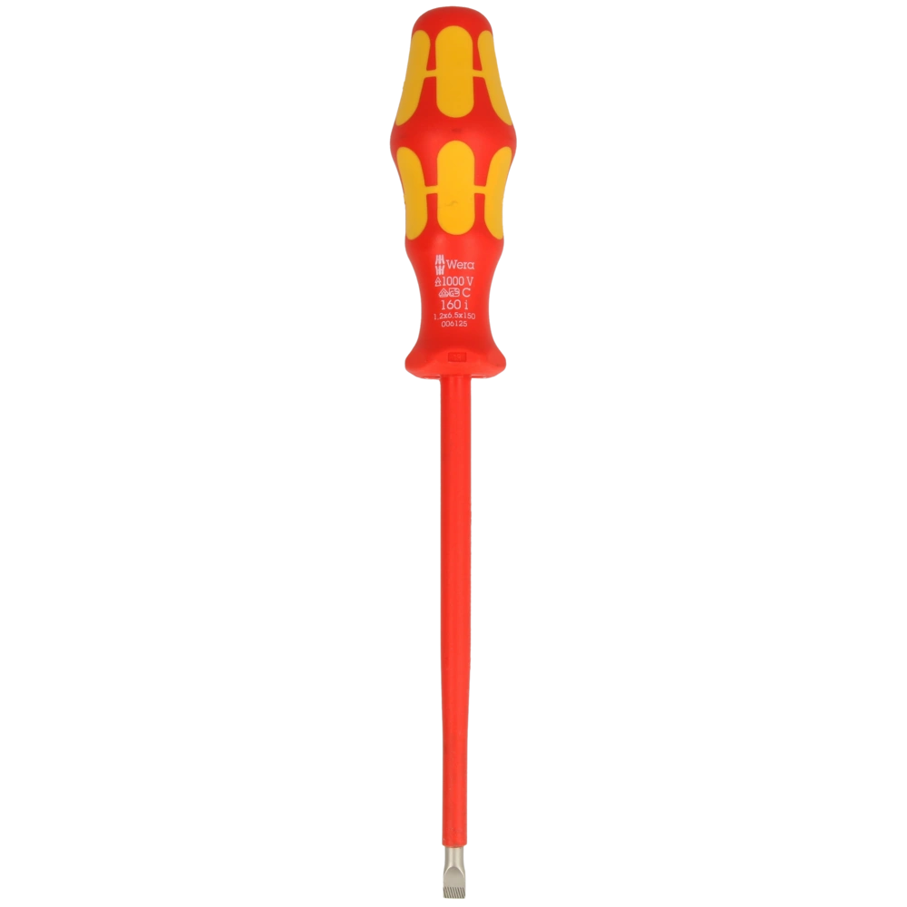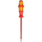 VDE-geïsoleerde, individueel geteste platte schroevendraaier voor veilig werken tot 1000 V volgens IEC 60900. De ergonomische Kraftform-handgreep heeft harde zones voor hoge werksnelheden en zachte zones voor een optimale koppeloverdracht...