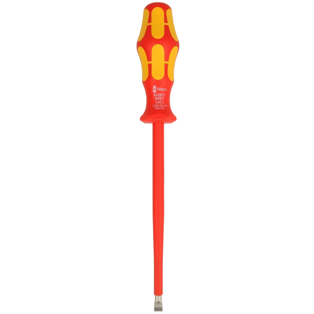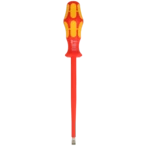 VDE-geïsoleerde, individueel geteste platte schroevendraaier voor veilig werken tot 1000 V volgens IEC 60900. De ergonomische Kraftform-handgreep heeft harde zones voor hoge werksnelheden en zachte zones voor een optimale koppeloverdracht...