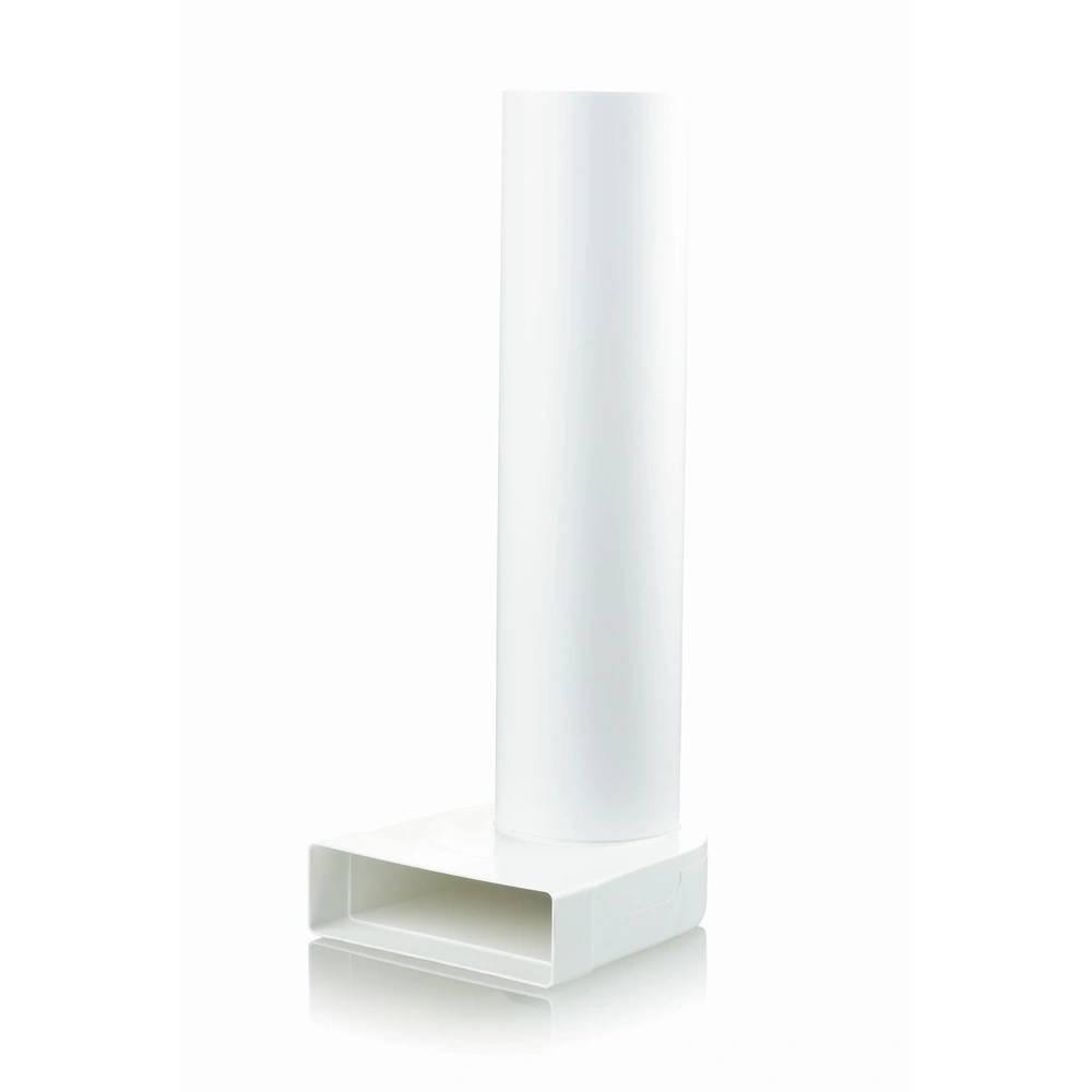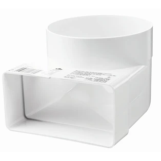 Afbuigstuk met ronde buis voor ventilatie in woongebouwen en kantoren. Het doorbuigstuk is geschikt voor het aansluiten van afzuigkappen, keukenkappen en andere elementen op het ventilatiesysteem en maakt de aansluiting van platte en ronde buizen mogelijk. Het gladde binnenoppervlak garandeert een lage weerstand en een vrijwel geruisloze werking.