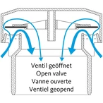 Als de ventilatieklep in de afvoer is geïnstalleerd, wordt het membraan geopend zodra negatieve druk ontstaat. De verse lucht die in het uitstroomkanaal stroomt compenseert de negatieve druk daar voordat het het water uit de sifon stroomt. In de tegenovergestelde richting is de klep absoluut dicht. De ontluchtingsklep kan verticaal op de rioolbuis worden geplaatst. Het kan worden geïnstalleerd in een verlaagd plafond, op zolder, onder de wastafel of in een geventileerde veranda muur.