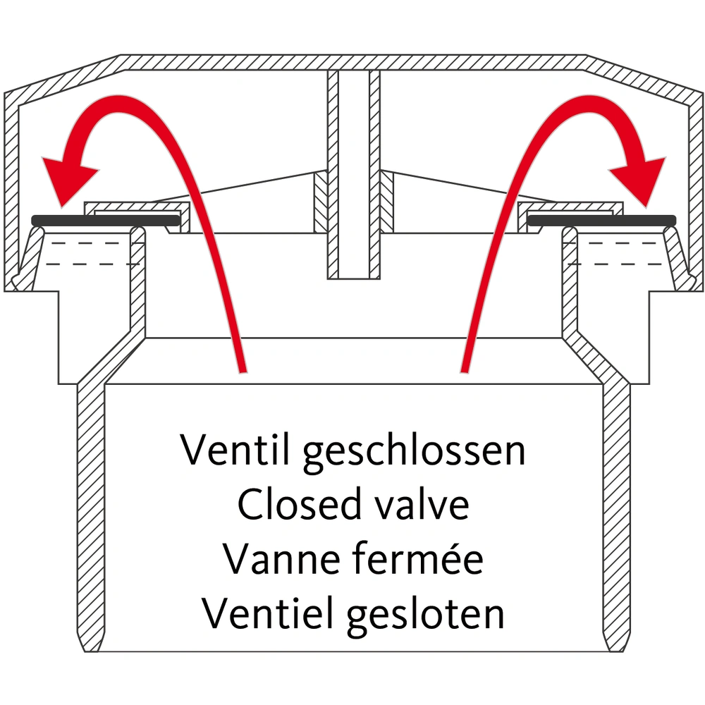 Als de luchttoevoerklep in de persleiding is geïnstalleerd, gaat het membraan open zodra er een vacuüm ontstaat. Door de frisse lucht die in de afvoerleiding stroomt, wordt de negatieve druk gelijk gemaakt, voordat het water uit de sifon wordt gezogen. De klep is absoluut dicht in de tegenovergestelde richting. De luchttoevoerklep moet verticaal op de afvalwaterleiding worden gemonteerd. Het kan worden geïnstalleerd in een verlaagd plafond, op zolder, onder de wastafel of in een geventileerd wandpaneelelement.