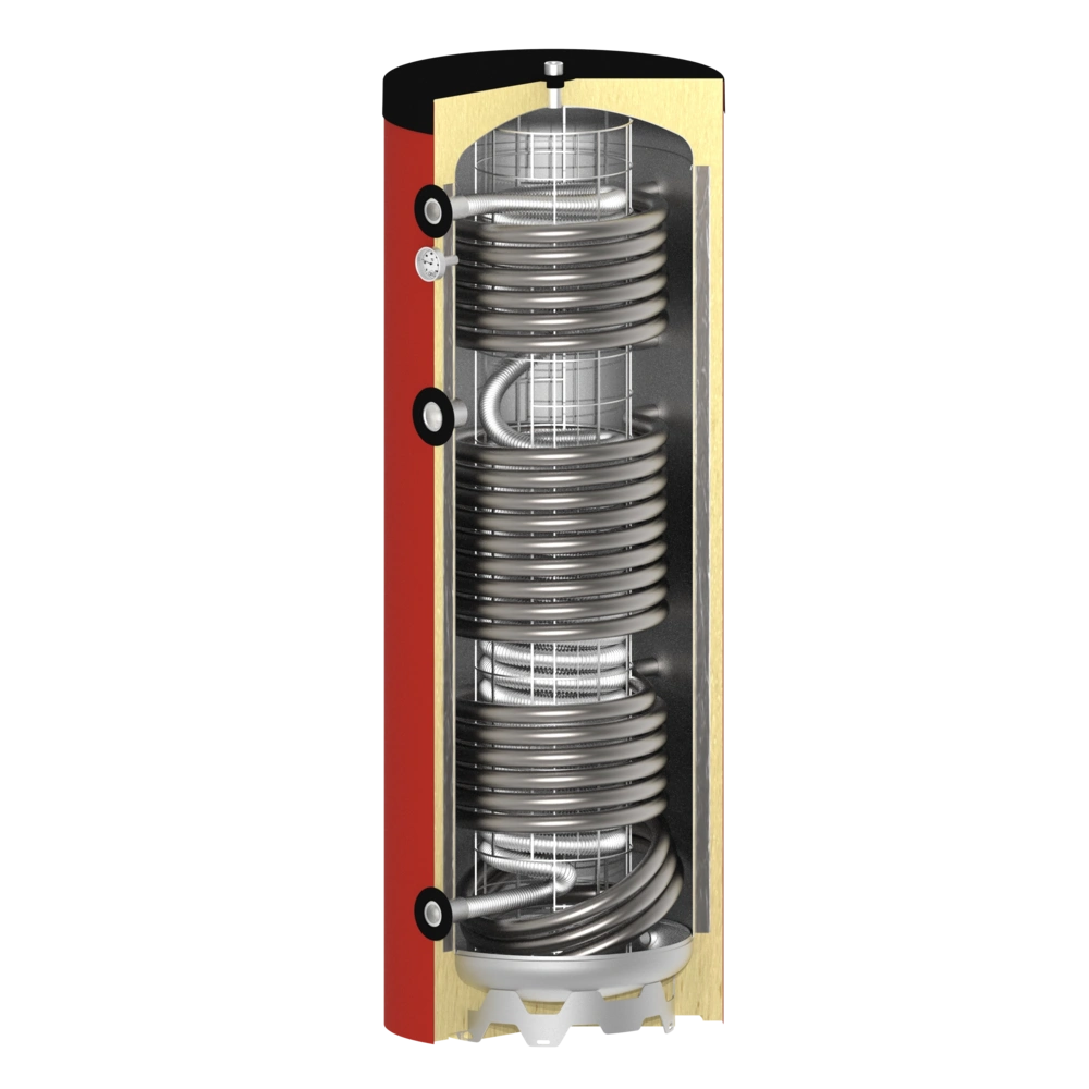 The structure of these storage tanks is fundamentally different from usual large-volume domestic-water tanks. A built-in stainless steel pipe separates the drinking water from the heating water and serves as a powerful heat exchanger at the same time. Thus, the advantages of a buffer tank are combined with those of an flow heater. The fresh drinking water runs through the corrugated stainless steel pipe in the water of the heated storage tank only if required and the stratification of the heating water is not disturbed. This leads to a very low energy consumption and guarantees legionella-free drinking water. You will not need a protective legionella programme in the regulation. By choosing additional smooth-pipe heat exchangers, more heat generators can be integrated and their energy can also be fed into the fresh-water storage tanks.