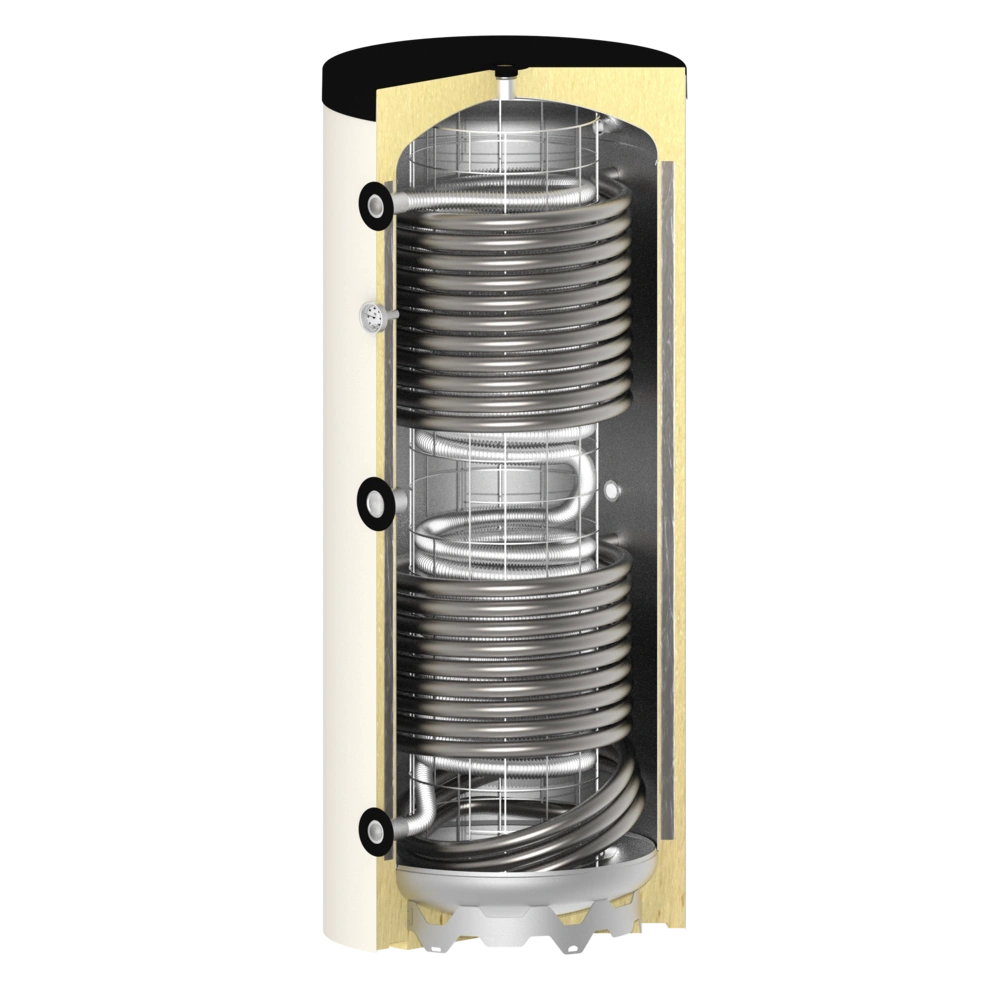 Il y a deux échangeurs thermiques en tube lisse pour le raccordement de différents générateurs de chaleur. Le troisième échangeur thermique est constitué d'un tube ondulé en acier inoxydable et est prévu pour le passage de l'eau d'appoint. L'eau sanitaire y est chauffée de manière hygiénique, comme dans un chauffe-eau instantané.
