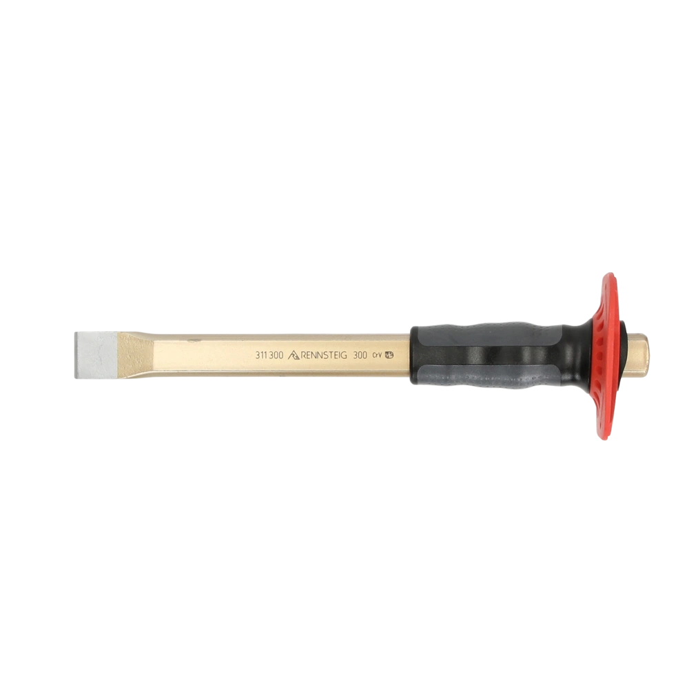 Platte beitel met handbescherming van luchtgehard chroom-vanadiumstaal. De volledig geharde beitel biedt een lange levensduur en goede elasticiteit. De slagkop-ontlaten volgens DIN 7255 voorkomt bijna versplintering en bolling. De schacht is geverfd.