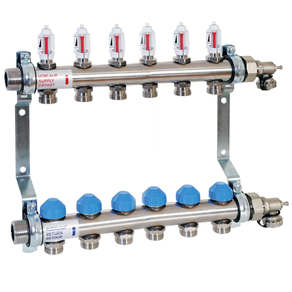 De verwarmingscircuitverdeler wordt volledig gemonteerd op een muurbeugel met buisklemmen geleverd.