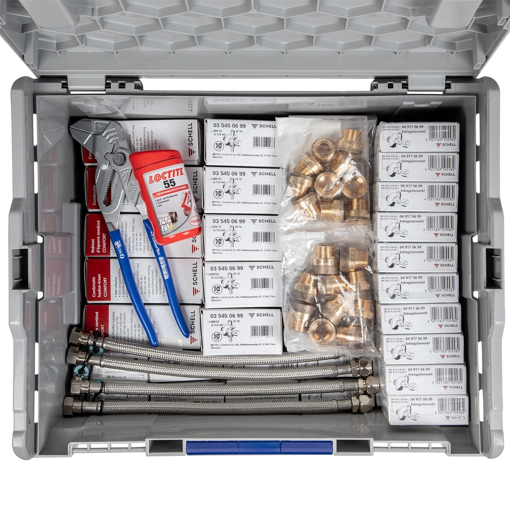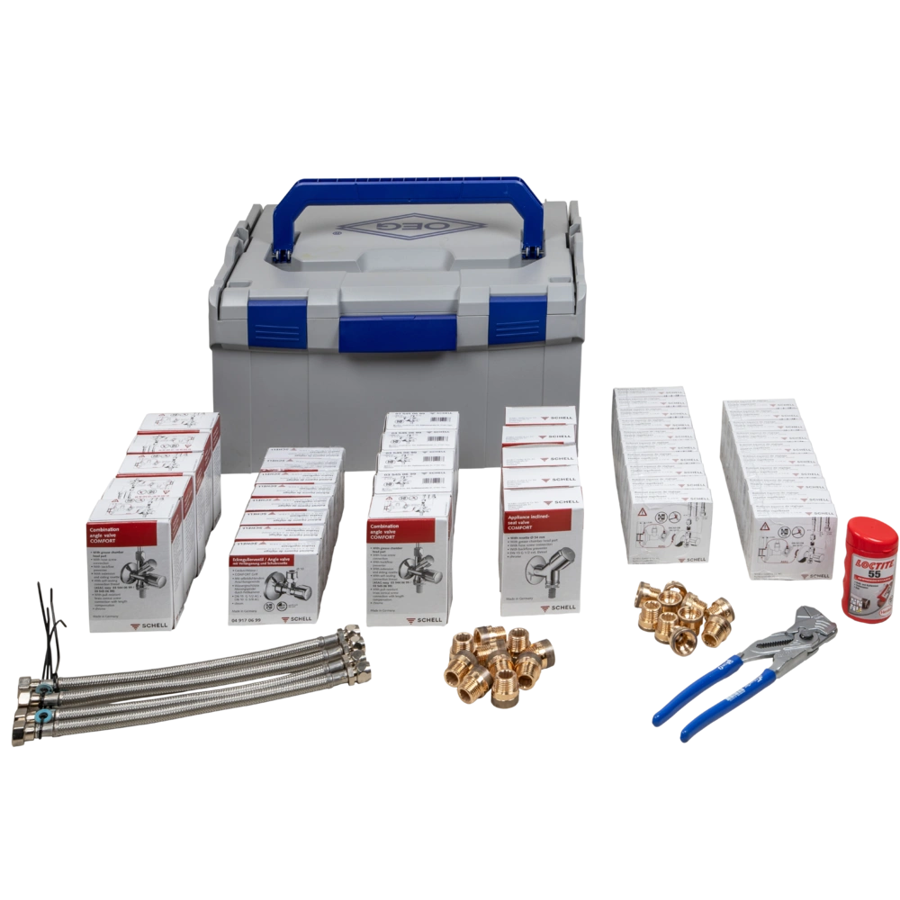 Voorraadpakket met Schell hoek- en apparaatkranen met bijpassende toebehoren. Het pakket bevat alles wat je nodig hebt om succesvol en snel wateraansluitingen te installeren in de keuken, badkamer of wasruimte...