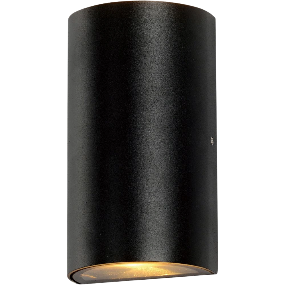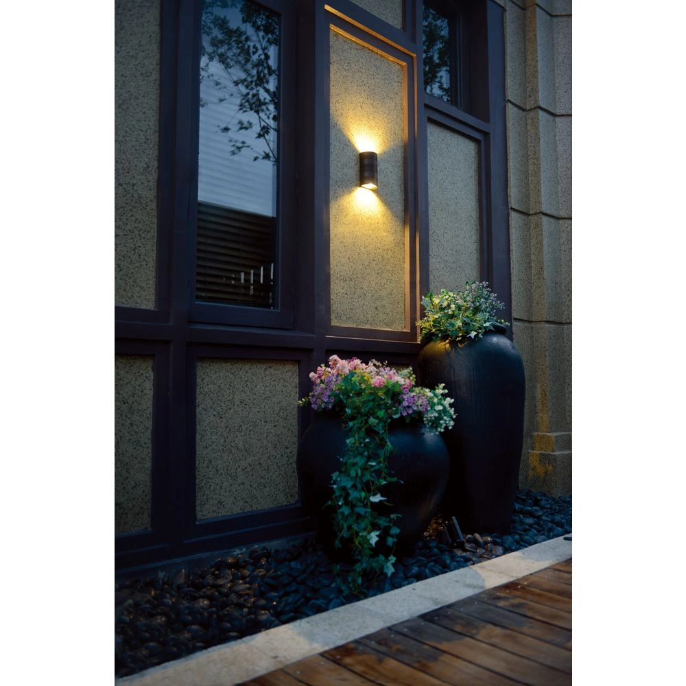 Wandlamp voor buitenmontage met een robuuste aluminium behuizing. Door de stralingshoek boven en onder ontstaat een zandlopervormige lichtkegel.
