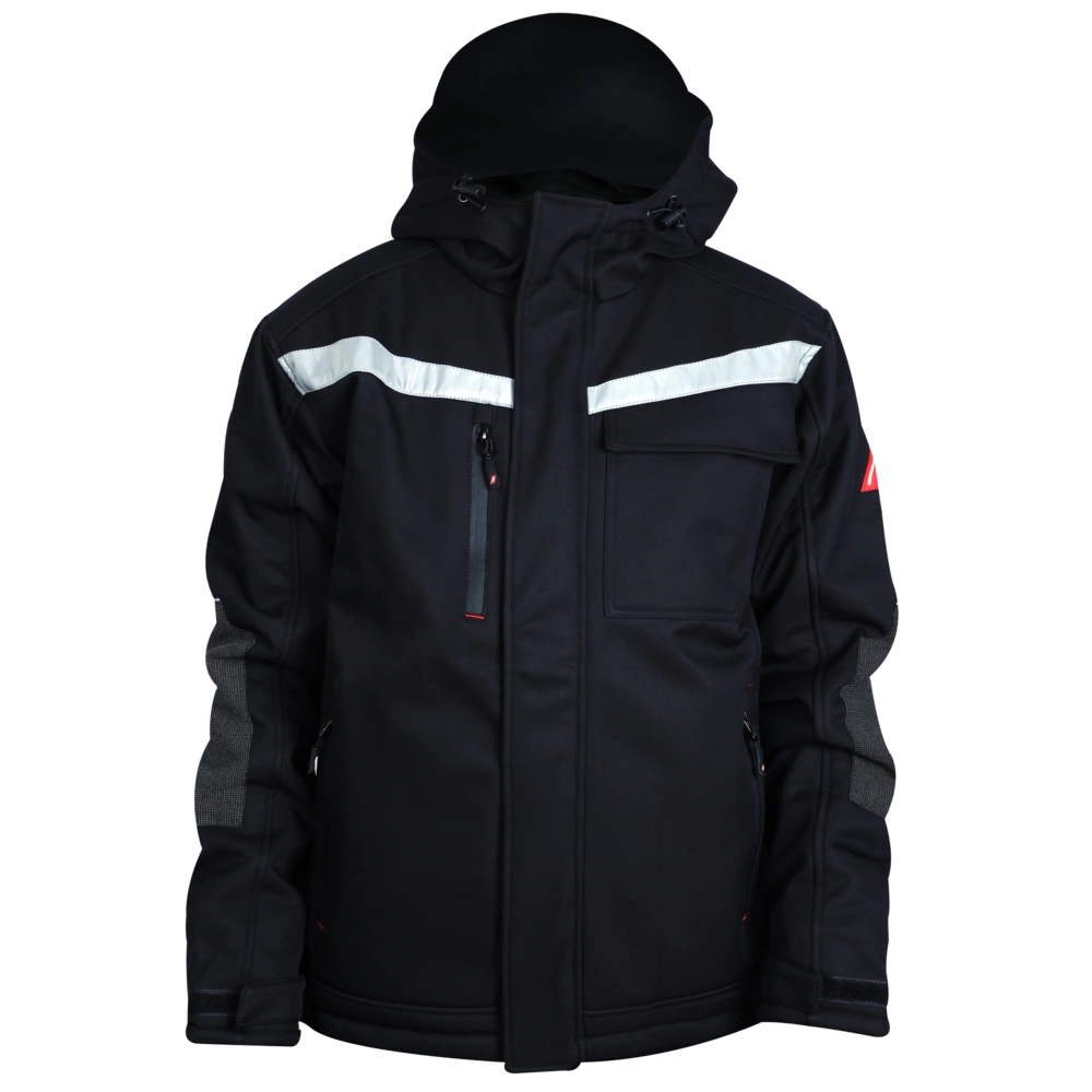 Het jack heeft een windstopper aan de voorkant en achter de YKK-rits. Het heeft een kinbescherming, verstelbare manchetten met klittenband, binnen-, zij- en borstzakken. Het softshell-jack is voorzien van een capuchon en pols warmers. Het werkjack is uitgerust met reflecterende elementen, zodat je sneller en beter wordt gezien in de schemering en duisternis.