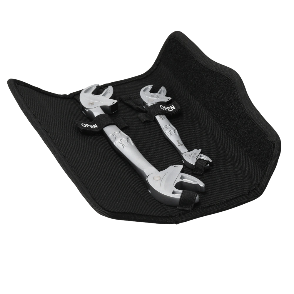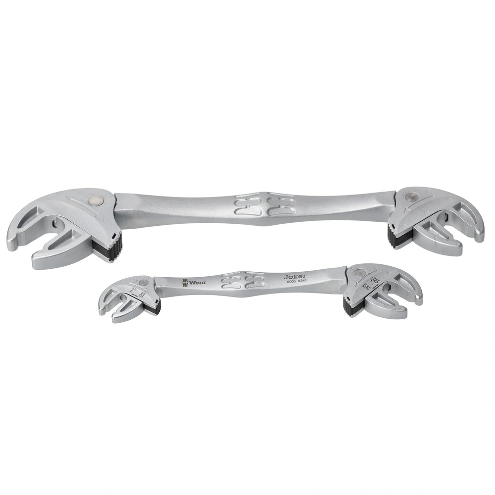 Twee gereedschappen – talrijke sleutelwijdtes: deze set vervangt vele afzonderlijke sleutels en vermindert de inspanning op de bouwplaats aanzienlijk. Bij het aanbrengen passen de bekken zich automatisch aan de schroefmaat aan. Het geïntegreerde hefboommechanisme zorgt voor een betrouwbare klemeffect, dat voor een veilige grip zorgt en beschadigingen voorkomt. Dankzij de ratelfunctie verloopt het schroeven soepel en moeiteloos, zelfs bij weinig bewegingsruimte. Met een terugslaghoek van slechts 30° ben je zelfs in krappe montagesituaties flexibel en gecontroleerd bezig. Voor transport wordt alles opgeborgen in een robuuste opvouwbare tas die compatibel is met het Wera 2go-systeem.