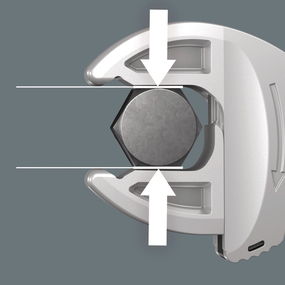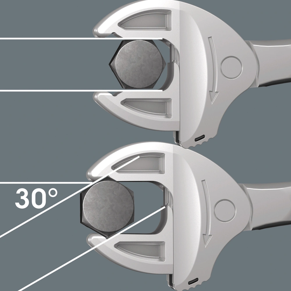 Zelfinstellende, universele steeksleutel voor snelle en eenvoudige montage. De gewenste maat wordt automatisch en continu aangepast wanneer deze aan de zeskantmoer of schroef wordt bevestigd. Het geïntegreerde hefboommechanisme klemt de zeskantschroef of moer stevig tussen de bekken, waardoor het risico op uitglijden en beschadiging aanzienlijk wordt verminderd. De ratelfunctie in de mond zorgt voor snel en continu schroeven zonder te stoppen. Dankzij de hoekbreedteprisma's is een terugstelhoek van slechts 30° mogelijk. Hierdoor kunt u ook in krappe ruimtes werken.