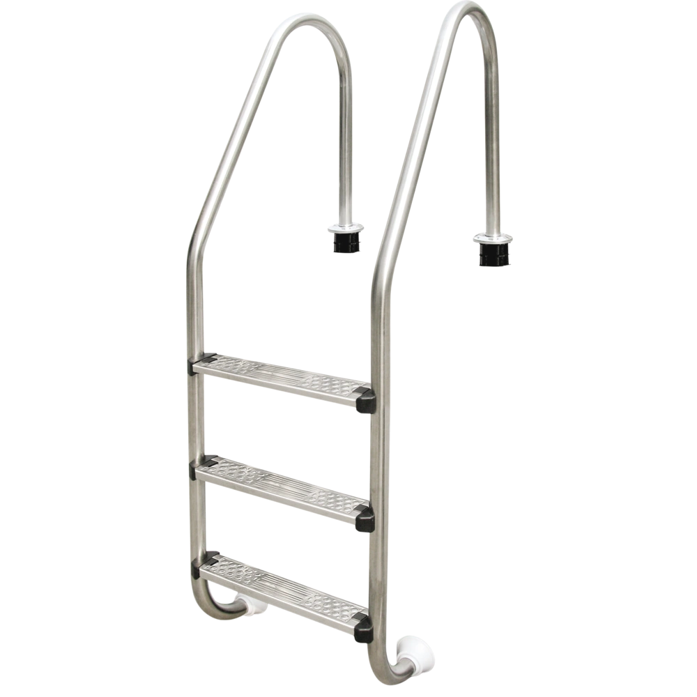 Instapladder voor zwembaden. Brede uitvoering met bevestigingspunten voor de leuning op een afstand van 496 mm van de zwembadrand. Voor een betere grip bij het opstappen zijn de treden voorzien van anti-slip pads.