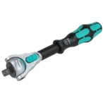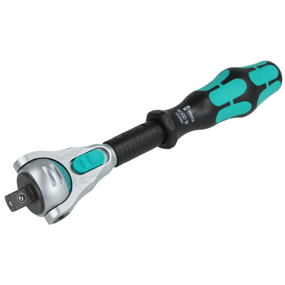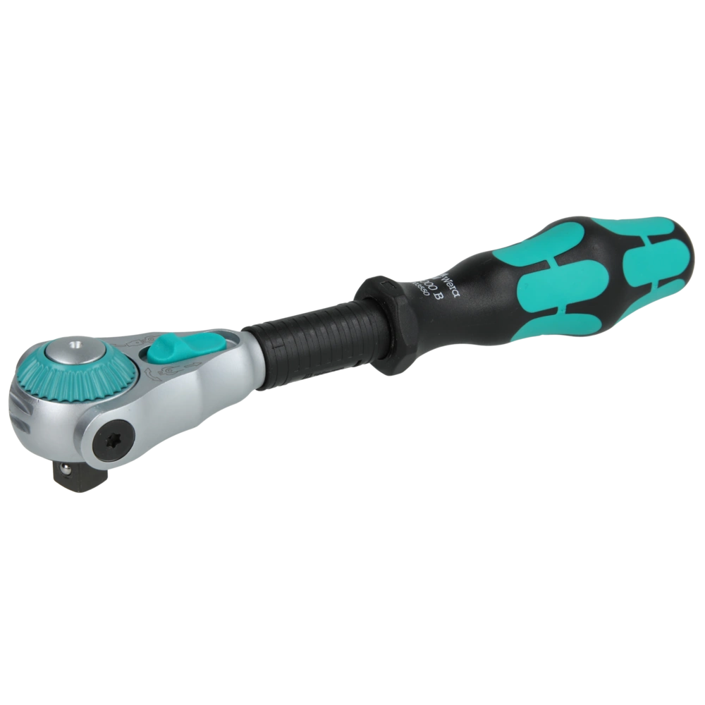De Zyklop-ratel met 3/8" aandrijving maakt door de fijnvertanding met 72 tanden een lage retourhoek van 5° mogelijk. De ratelkop is vrij draaibaar en kan in elke positie worden vergrendeld door de dubbelzijdige schuifschakelaar. De gedefinieerde fixatie op 0°, 15° en 90° links en rechts garandeert een veilige werking zonder slippen van de ratelkop. In de 0° -positie is de ratel met adapter en bit zoals een conventionele schroevendraaier worden gebruikt.